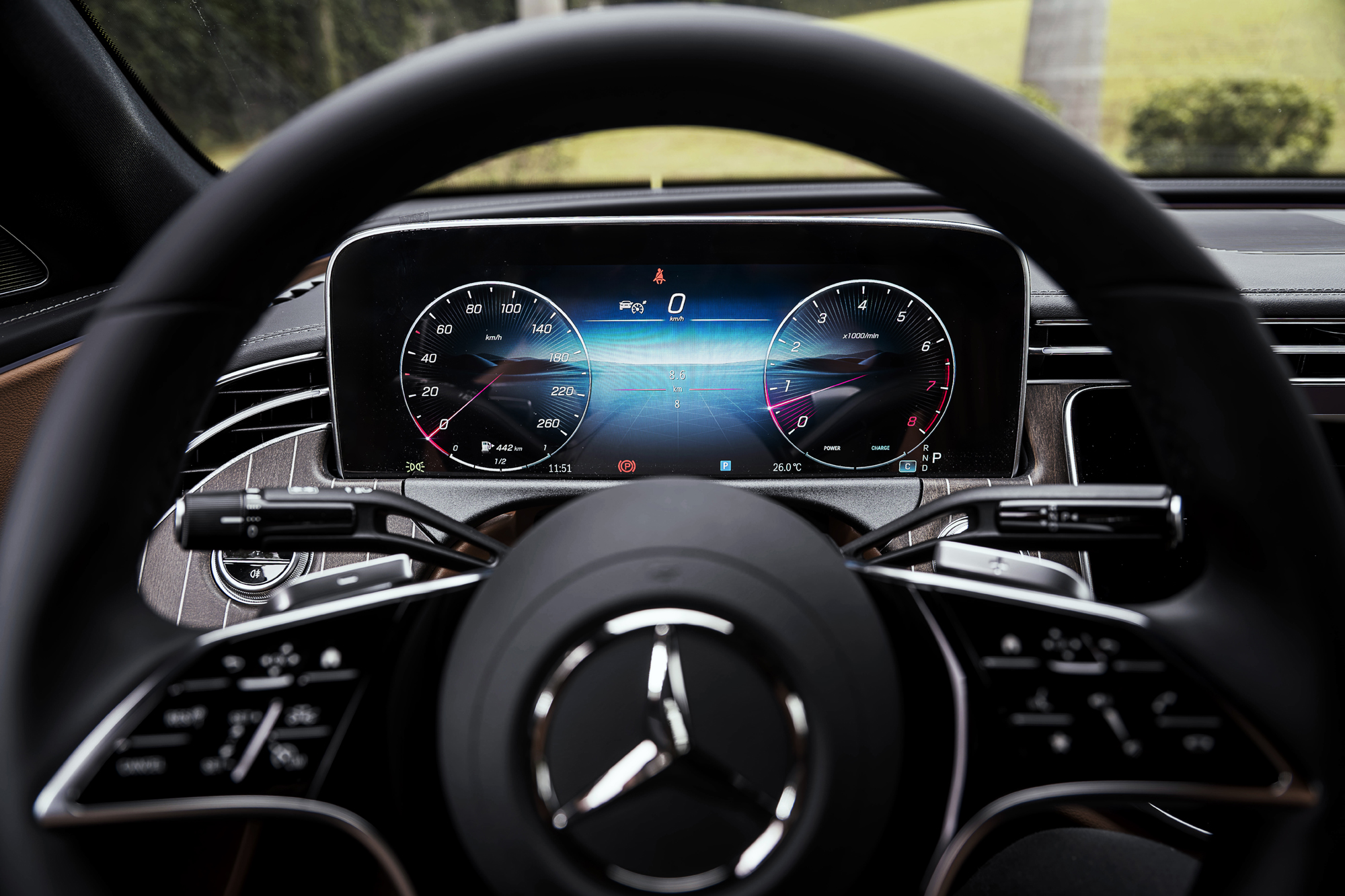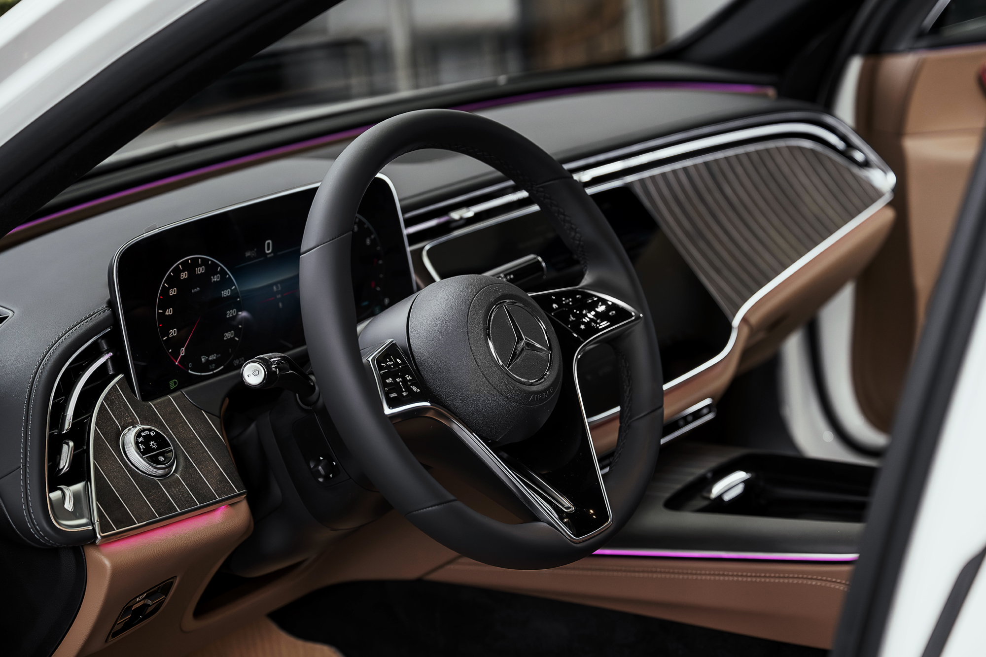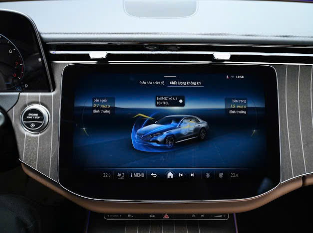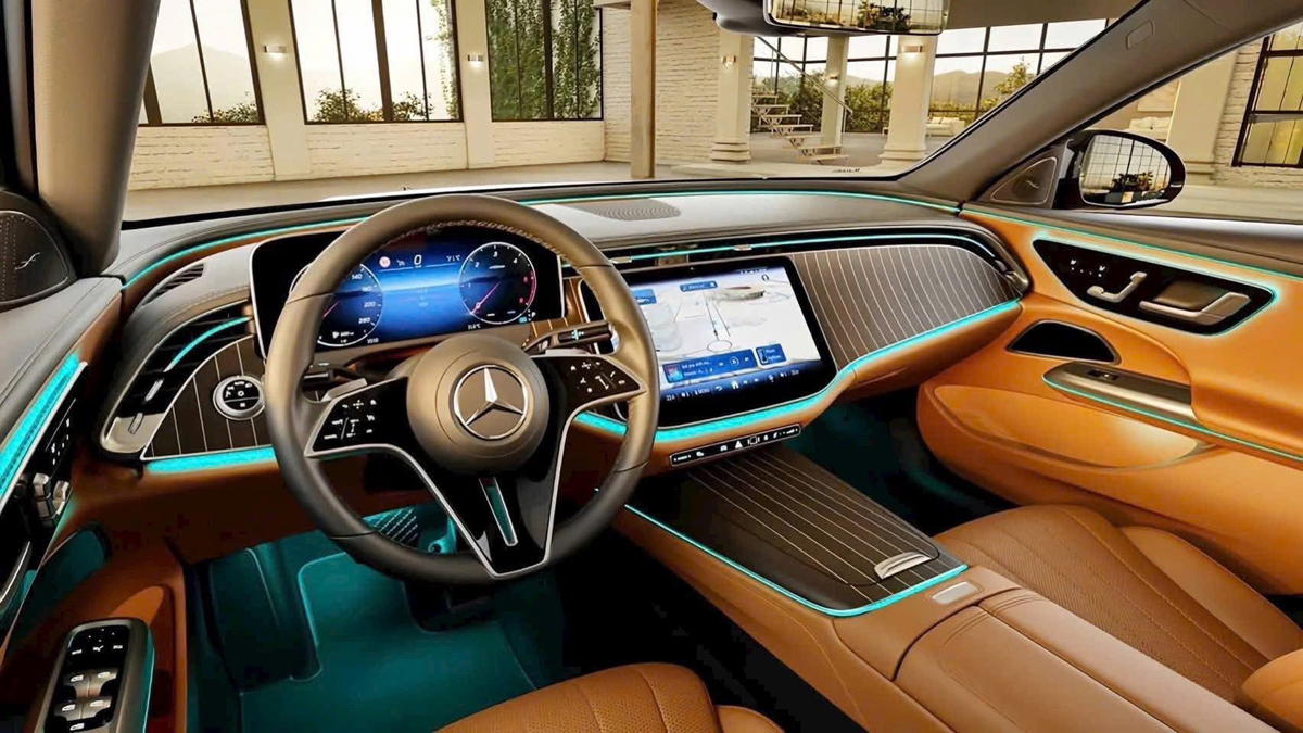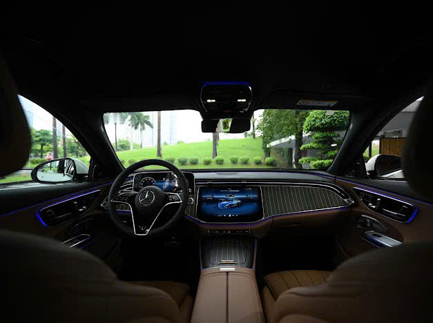 Ghế bọc da ARTICO cao cấp, kết hợp các đường may tinh tế và ốp gỗ mở Walnut nâu bóng loáng. Đèn viền nội thất với 64 màu tùy chỉnh tạo không gian ấm cúng và sang trọng, trong khi vô lăng bọc da Nappa tích hợp các phím điều khiển cảm ứng mang lại cảm giác lái tiện lợi. Thiết kế nội thất lấy cảm hứng từ S-Class, với bảng điều khiển đối xứng và các chi tiết mạ chrome, làm nổi bật phong cách thượng lưu, lý tưởng cho các buổi tiếp đón đối tác hoặc gia đình..