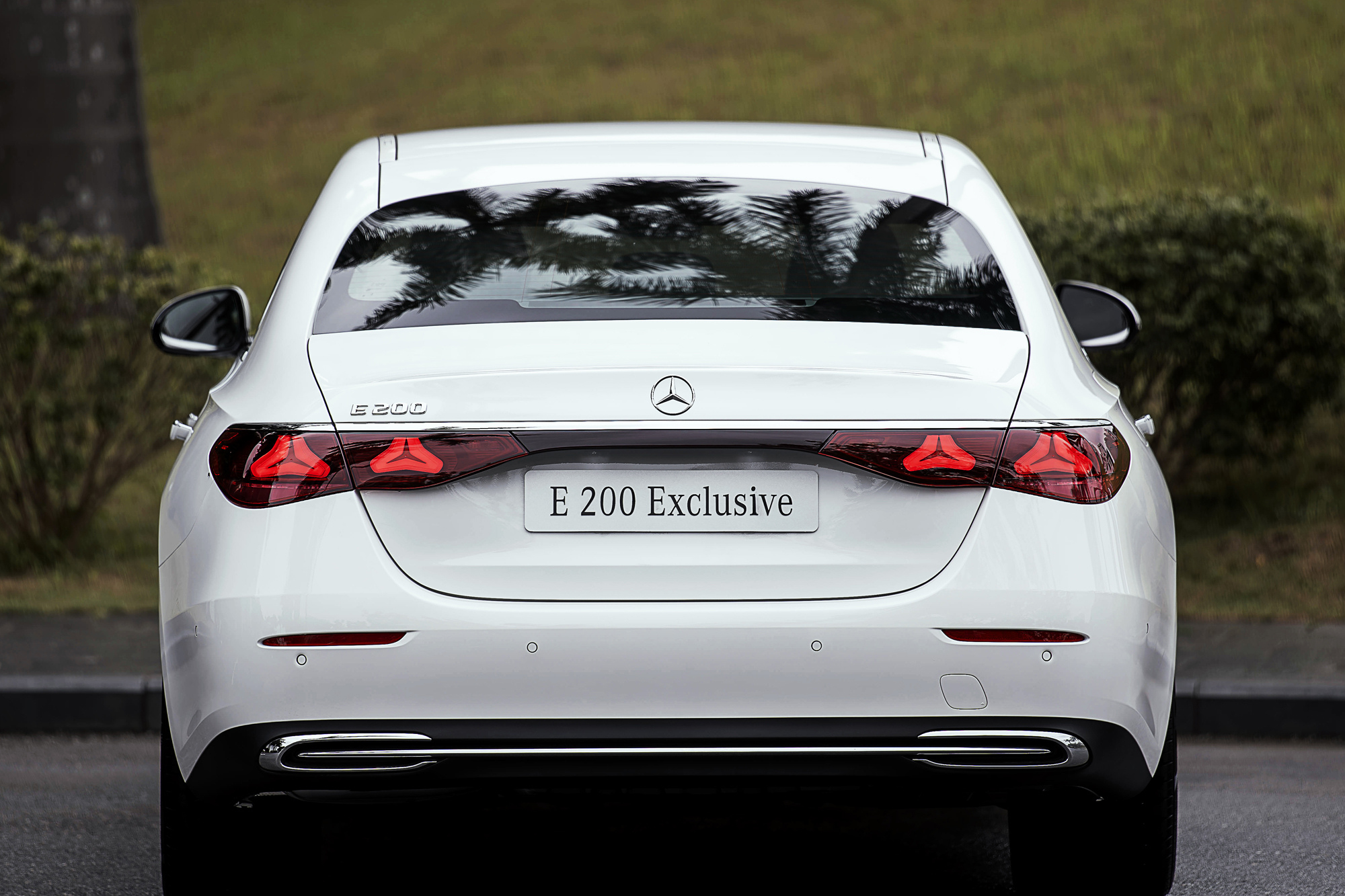 Đuôi xe của Mercedes E200 Exclusive 2025 mang lại sự liền mạch và thanh lịch với cụm đèn hậu LED hình “logo Mercedes-Benz” tinh tế. Thanh chrome sáng bóng kéo dài ngang đuôi xe, kết nối hai bên đèn hậu, làm nổi bật chiều rộng và tạo hiệu ứng ánh sáng ấn tượng khi di chuyển vào ban đêm. Cản sau với ống xả kép đối xứng (tùy chọn) và thiết kế khí động học hoàn thiện vẻ ngoài sang trọng